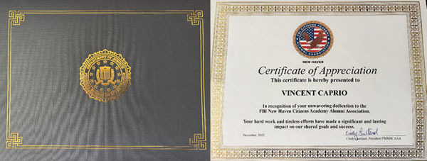 On December 6, 2025 I was honored with an Award by the FBI New Haven Citizens Academy Alumni Association (FBINHCAAA) for my Service to our Connecticut Community. I thank my colleagues and I have enjoyed working with our team serving Connecticut and America.